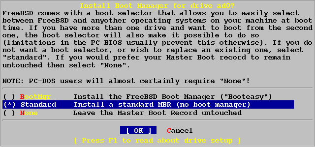 Прежде всего, выберите желаемую опцию загрузки Boot Manager при помощи клавиш со стрелками, затем нажмите [ПРОБЕЛ]. Звездочка "*" будет указывать на выбранную опцию. В этой инсталляции весь диск был отдан под FreeBSD, поэтому boot manager был не нужен.