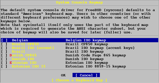 Здесь представлен лишь неполный список. Выбрав [CANCEL], вы вернетесь в главное меню инсталляции к выбору клавиатурой раскладки.