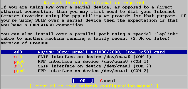 Если у вас предварительно уже было настроено PPP соединение для установки по FTP, этот экран у вас не появится. Однако, сетевые настройки могут быть изменены заново до выхода из установки и перезагрузки системы, или после перезагрузки с помощью команды /stand/sysinstall.