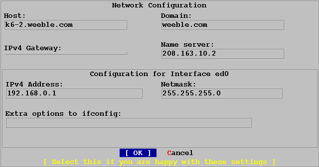 При ответе [Yes] будет запущен dhclient и если его работа завершится успешно, настройки сетевой конфигурации будут заполнены автоматически. Для более детальной информации, читайте FreeBSD Handbook.