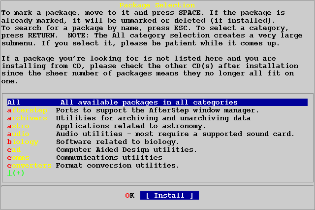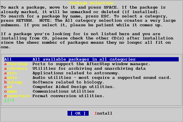 Чтобы вам высветились все доступные пакеты, выбирите "All". Имейте ввиду, некоторые дополнительные пакеты могут быть на других CD дисках из дистрибутива. Они могут быть добавлены позже используя программу /stand/sysinstall.