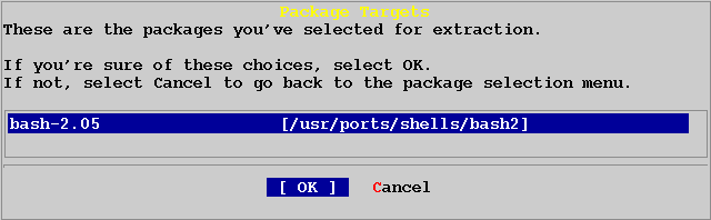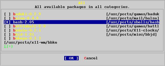 В целях иллюстрации, я покажу установку-добавление одного пакета - bash shell. Одновременно с этим, по желанию, могут быть выбраны и установлены и другие дополнительные пакеты. Остальные, могут быть установлены позже, используя программу /stand/sysinstall или /usr/sbin/pkg_add.