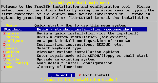 "Стандартная" инсталляция - опция, рекомендованная для начинающих пользователей unix или FreeBSD. Используя клавиши со стрелками, выберите опцию "Standard", а затем нажмите ENTER, чтобы начать инсталляцию.