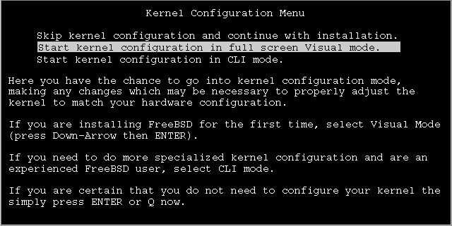 Для новичков рекомендуется использовать метод "Start kernel configuration in full screen Visual mode". С помощью клавиш "стрелок" выбрать указанный выше пункт меню и нажать ENTER.