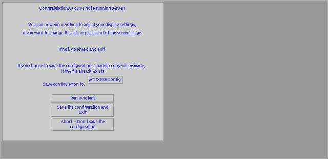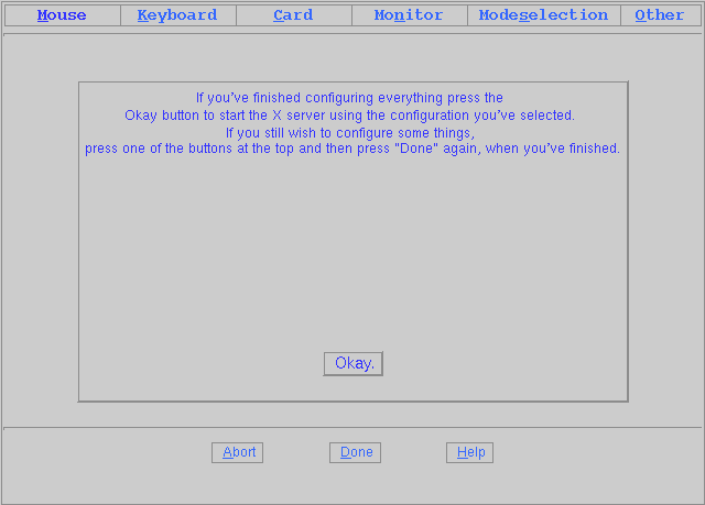 После выбора [OKAY] появится короткое сообщение подождать пока запускается X-Сервер. Этот процесс требует некоторого времени, будьте терпеливы. Экран погаснет на некоторое время и затем появится сообщение: