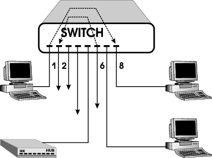 Современный Ethernet Switch может иметь до 16 портов и производить передачу пакета между любыми двумя независимо от остальных. Например, если на порт 1 поступил пакет, получатель которого подключен к порту 8 ( Рис. 6 ), и одновременно с ним на порт 6 поступил пакет для получателя на порту 2, то Switch передаст их оба одновременно. В случае обычного хаба это бы вызвало коллизию и пакеты должны были бы быть переданы последовательно. Пиковая пропускная способность 8-портового Switch-a может достигать 40Мбит/с, а 16-портового 80 Мбит/с (4 или 8 одновременно пересылаемых пакетов).