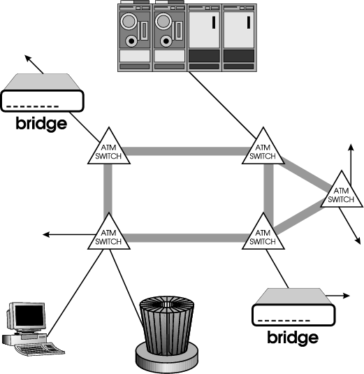 Структура АТМ достаточно проста ( Рис. 7 ), в основе ее лежит сеть из АТМ Switch-ей (в простейшем случае он может быть один), соединенных между собой высокоскоростными (обычно оптоволоконными) каналами связи. Сеть АТМ Switch-ей представляет из себя высокоскоростной коммутатор для пакетов, поступающих по внешним интерфейсам от внешних устройств - бриджей, рутеров, отдельных компьютеров или другого оборудования.